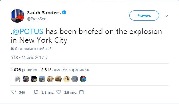 "Президент проинформирован о взрыве в Нью-Йорке", — написала она в Twitter.