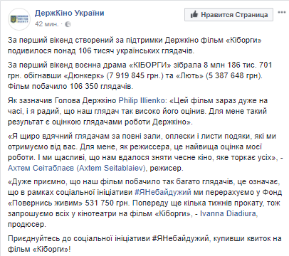 "Фильм" Киборги "установил новый рекорд для национальных фильмов в отечественном прокате по кассовым сборам в первый уикенд - 8 млн 186 тыс. 701 грн", - написал Илленко.