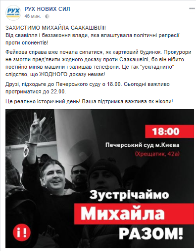 Соратники Михаила Саакашвили объявили о сборе людей в 18.00 у здания Печерского райсуда в Киеве, где проходит заседание об избрании меры пресечения для экс-губернатора Одесской ОГА и бывшего президента Грузии. Объявление появилось на странице политической партии "Рух новых сил" в Facebook.