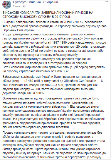 Всего на службу отправили 12 460 человек, в том числе в Вооруженные Силы Украины - 8360, Нацгвардию - 3500, Государственную специальную службу транспорта - 600.