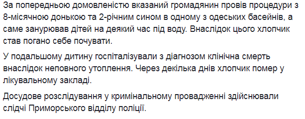 Такие водные процедуры он провел с двумя детьми в одном из одесских бассейнов, он погружал их на некоторое время в воду. Позже самочувствие мальчика ухудшилось. Его госпитализировали с диагнозом клиническая смерть вследствие неполного утопления. В больнице ребенок умер.