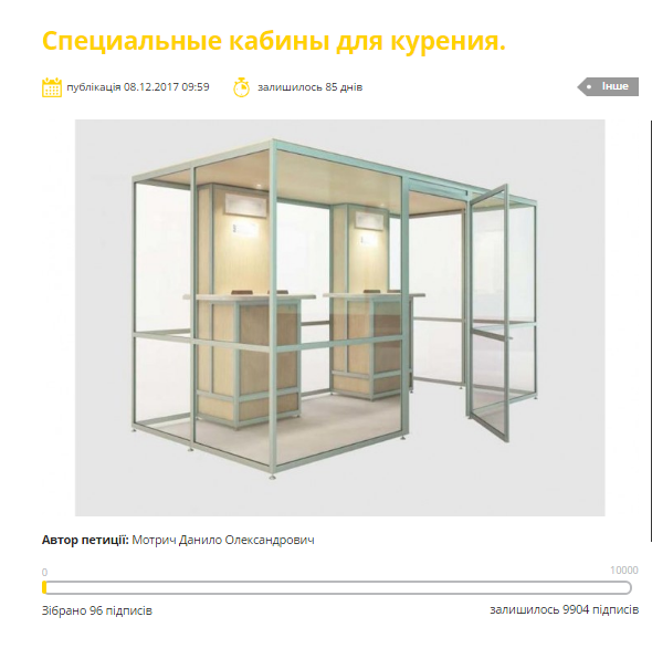 По словам автора петиции, несмотря на действующий запрет курения в общественных местах, люди все равно продолжают курить на улицах Киева. "Было бы неплохо, чтобы сделали побольше специально отведенных для этого мест (кабинок для курения). Тем самым мы сможем добиться того, чтобы люди перестали нарушать закон и перестали загрязнять окружающую среду", - говорится в тексте петиции.