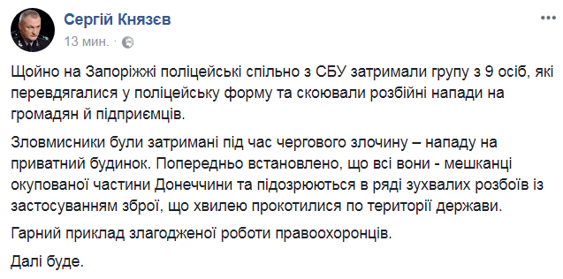 "Предварительно установлено, что все они - жители оккупированной части Донецкой области и подозреваются в ряде дерзких разбоев с применением оружия, волной прокатились по территории государства", - сообщил глава Нацполиции Сергей Князев.