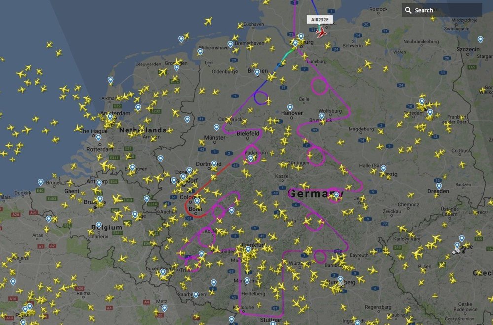 Самолет Airbus A380 авиакомпании Emirates изобразил в небе над Германией рождественскую елку с игрушками. Отследить полет судна можно на ресурсе Flightradar24.
