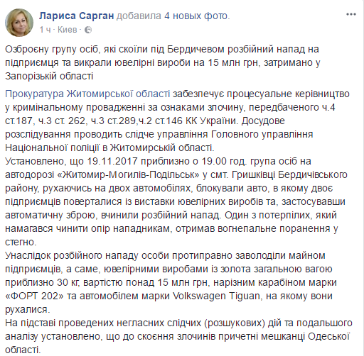 В Запорожской области задержали группу лиц, которые в ноябре этого года в Житомирской области совершили вооруженное нападение на автомобиль, в котором двое предпринимателей перевозили ювелирные изделия на сумму 15 млн гривен и весом 30 килограмм. Об этом на свой странице в Facebook сообщает пресс-секретарь генерального прокурора Украины Лариса Сарган.