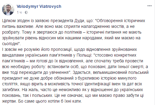 "Полностью согласен с заявлением президента Дуды, что "обсуждение исторических вопросов важно. Но оно должно способствовать налаживанию мостов, а не раздора. Поэтому я обращаюсь к политикам - исторические вопросы не должны разрушать уровень отношений между нашими народами, который мы имеем сегодня". И совсем не понимаю его предложения по восстановлению разрушенных вандалами украинских памятников в Польше: "В отношении конкретных памятников - мы готовы к их восстановлению, но сначала надо провести всю необходимую работу: установить лиц, которые похоронены, даты их смерти, а уже тогда переходить к увековечению", - написал Вятрович на своей странице в соцсети Facebook в среду.