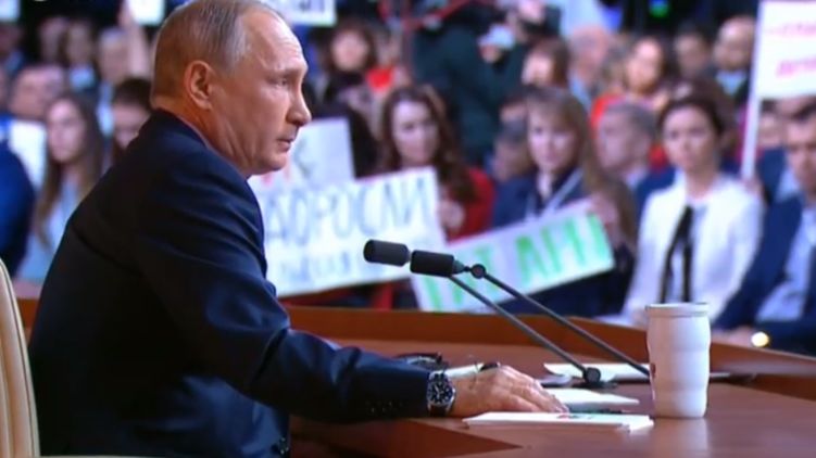 Традиция таких масштабных встреч с журналистами у Путина насчитывает уже несколько лет. Присутствуют представители СМИ со всего мира, которые часто задают российскому лидеру неудобные вопросы.