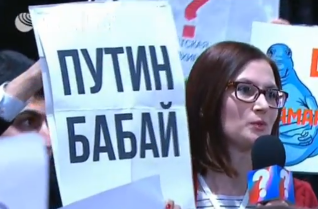 Также в зале видны вот такие плакаты - "Путин бабай".