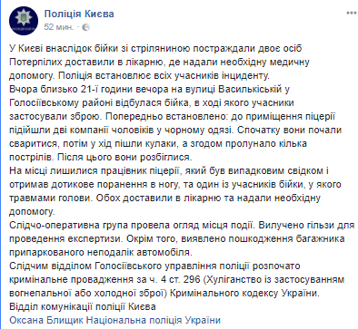 "Следственно-оперативная группа провела осмотр места происшествия. Изъяты гильзы для проведения экспертизы. Кроме того, обнаружено повреждение багажника припаркованного неподалеку автомобиля. Следственным отделом Голосеевского управления полиции начато уголовное производство по ч. 4 ст. 296 (хулиганство с применением огнестрельного или холодного оружия) Уголовного кодекса Украины", - говорится в сообщении.