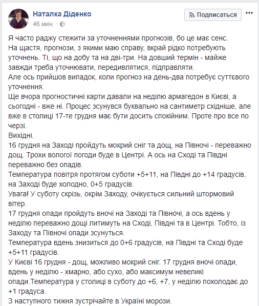 "Еще вчера прогностические карты давали на воскресенье армагеддон в Киеве, а сегодня - уже нет. Процесс сдвинулся буквально на сантиметр восточнее, но уже в столице 17-е декабря должен быть достаточно спокойным", - пишет Диденко.