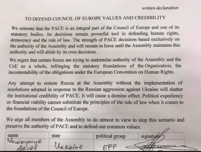 "В тексте выражается сожаление из-за того что определенные силы в Совете Европы пытаются подорвать авторитет Ассамблеи числе и СЕ в целом. Подписанты также заявляют, что попытка безусловно восстановить делегацию РФ в правах полностью разрушает авторитет ПАСЕ и вызовет эффект домино в организации и призывают остановить этот сценарий", - написал Арьев.