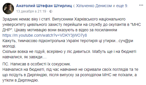 Пользователь Анатолий Штефан Штирлиц пишет, что, по словам одногруппников молодых людей на видео, те не скрывали своих взглядов во время учебы: "Учились на бюджете, во время учебы не скрывали своих взглядов и что поедут в Дирляндию, после выпуска по распределению МЧС не поехали, а бежали в Дирляндию". Также он возмущается словам Овчинникова о том, что он учился на "временно подконтрольной Украине территории".