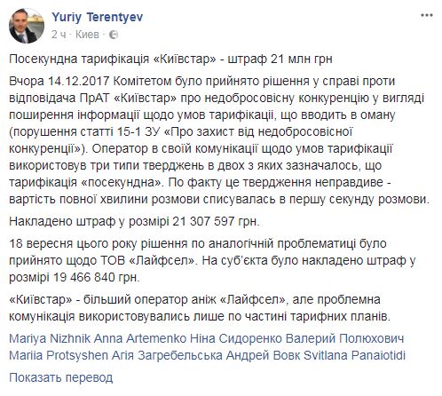 18 сентября за аналогичное нарушение lifecell был оштрафован на 19,5 млн гривен.
