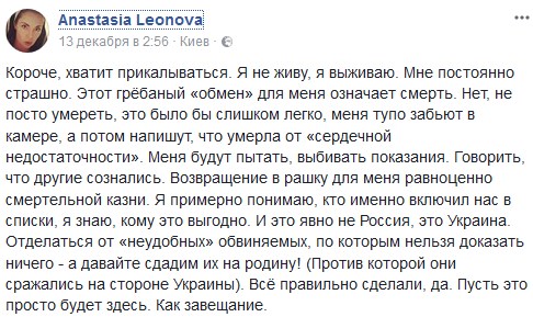 "Короче, хватит прикалываться. Я не живу, я выживаю. Мне постоянно страшно. Этот грёбаный "обмен" для меня означает смерть. Нет, не посто умереть, это было бы слишком легко, меня тупо забьют в камере, а потом напишут, что умерла от "сердечной недостаточности". Меня будут пытать, выбивать показания. Говорить, что другие сознались. Возвращение в рашку для меня равноценно смертельной казни", - написала она.