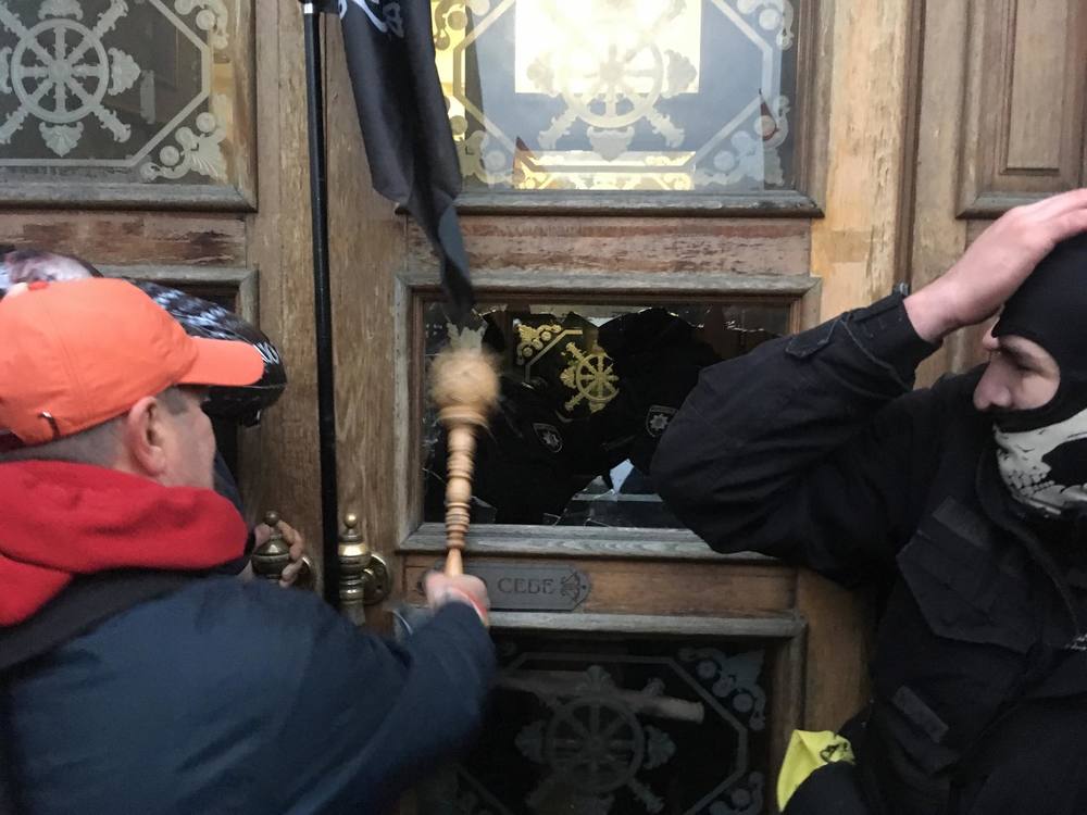 15:25  Выбили стекла в двери. Но изнутри полиция начала поливать майдановцев из порошковых огнетушителей. Поэтому внутрь активисты еще не пробрались.