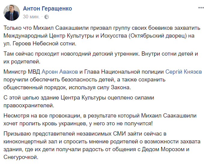 15:46  Нардеп Антон Геращенко утверждает, что в зале дворца идут детские утренники. По его словам, глава МВД Арсен Аваков поручили "обеспечить порядок".