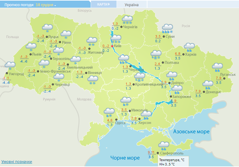 В Винницкой, Кировоградской, Черкасской, Полтавской, Киевской, Черниговской и Сумской областях сложные погодные условия: дождь и снег, местами сильные осадки, налипание мокрого снега, гололед, на дорогах гололедица, метели. Днем воздух прогреется от -1 до +4.