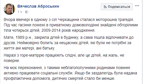 "Вчера вечером в одном из сел Черкащины произошла жуткая трагедия. Во время тушения пожара в частном домовладении обнаружены обгоревшие тела четырех детей", - написал  Аброськин.
