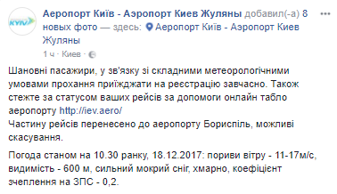 "В связи со сложными метеорологическими условиями часть рейсов перенесено в аэропорт" Борисполь ", возможны отмены", - говорится в сообщении.