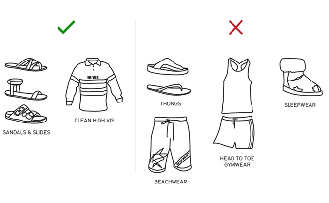 Помимо уггов, под запрет попали пляжная одежда для сна (к которой почему-то относятся угги), одежда с лозунгами, нечистая или порванная одежда, босые ноги.