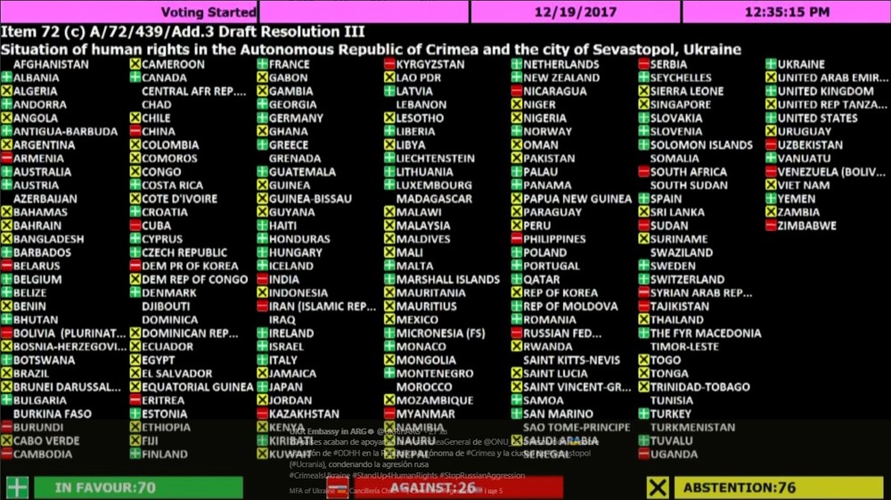 Как сообщает посольство Украины в Аргентине в Twitter, 26 стран-членов Генассамблеи ООН проголосовали против обновленной резолюции по правам человека в оккупированном Крыму.