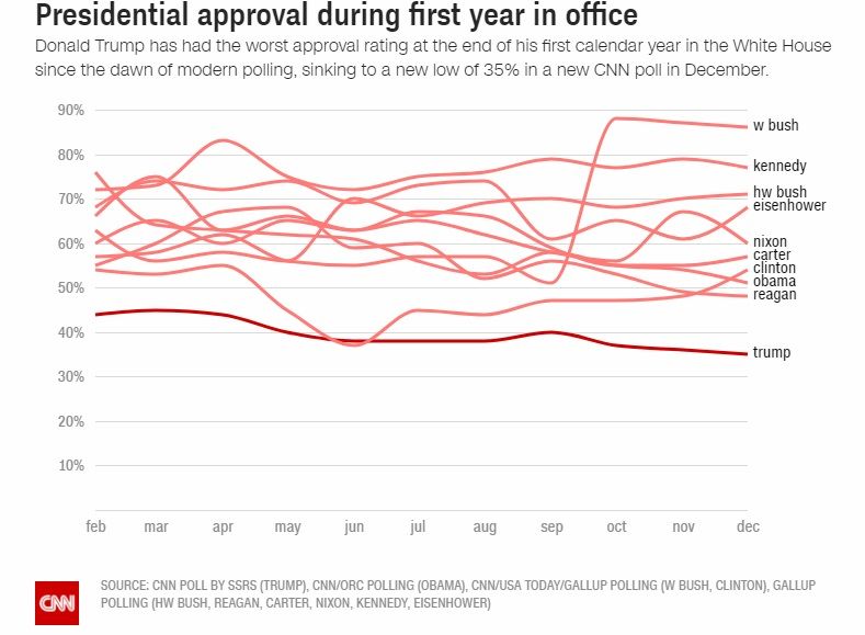 Через год на посту президента у Дональда Трампа - самый низкий рейтинг среди всех президентов США. Об этом сообщает CNN.