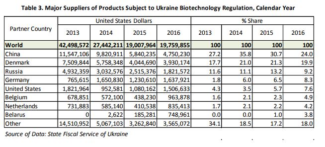 "Согласно отчетам, некоторые произведенные в Украине пищевые продукты иногда дают положительный результат на наличие следов генно-инженерной деятельности, что свидетельствует о возможности наличия в стране источников семян, полученных методом генной инженерии, или о ввозе таких семян из-за рубежа. На украинском рынке ходят слухи, что 60-70% соевых бобов и 3-5% кукурузы, предназначенных на экспорт, произведены при помощи генной инженерии", - говорится в докладе.
