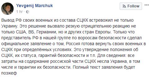 "Только что представитель РФ в нашей группе по вопросам безопасности сделал официальное заявление о том, что Россия готова вернуть своих военных в СЦКК при определенных условиях. Это утверждение положения об СЦКК, их статуса, гарантий безопасности и т.п.", - написал Марчук.