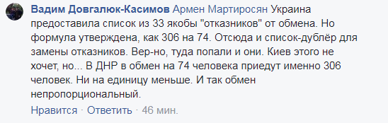 "Украина предоставила список из 33 якобы "отказников" от обмена (пленных с "ЛДНР" - Прим.Ред.). Но формула утверждена, как 306 на 74. Отсюда и список-дублёр для замены отказников. Вер-но, туда попали и они. Киев этого не хочет, но... В ДНР в обмен на 74 человека приедут именно 306 человек. Ни на единицу меньше. И так обмен непропорциональный", - заявил Довгалюк-Касимов.