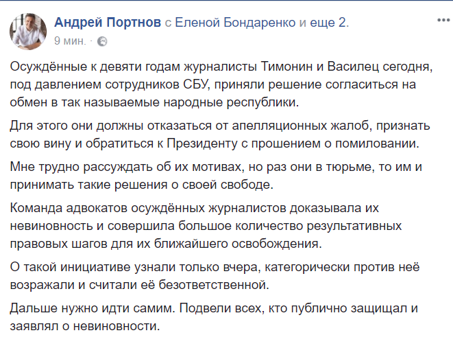"Осуждённые к девяти годам журналисты Тимонин и Василец сегодня, под давлением сотрудников СБУ, приняли решение согласиться на обмен в так называемые народные республики.