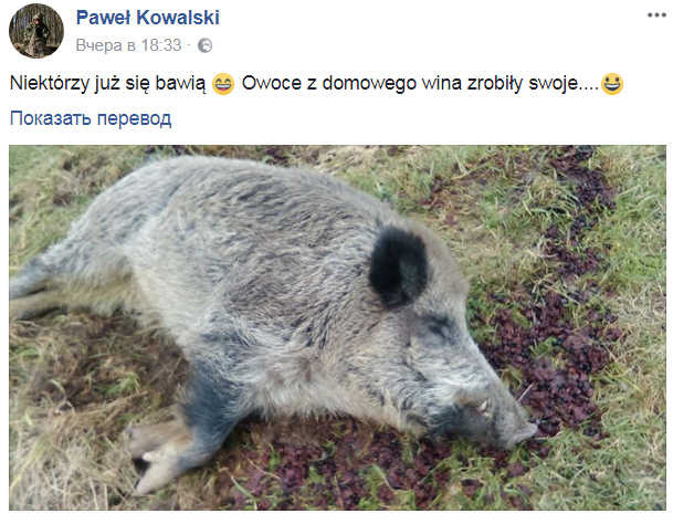 По его словам, Хрюмек нашел фрукты, оставшиеся от изготовления домашнего вина, наелся их и заснул среди остатков. Удивленный находкой фермер вызвал егеря, чтобы тот забрал кабана, который протрезвел уже в своем отряде.