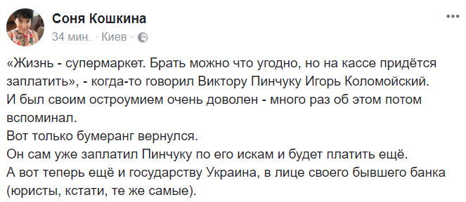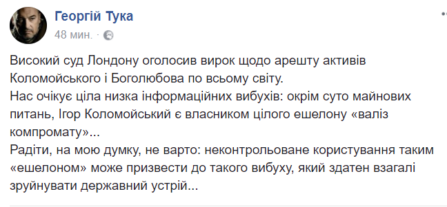 Накануне решения Высокого суда 7 декабря Генеральная прокуратура Украины возбудила дело против руководства Нацбанка, государственных менеджеров "Приватбанка" и агентства "Кролл", обвинив их самих в хищении средств банка", - пишет журналист.