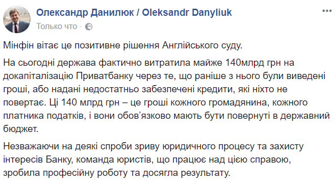 "Мы приветствуем это положительное решение Английского суда. На сегодня государство фактически потратило почти 140 млрд грн на докапитализацию Приватбанка из-за того, что ранее из него были выведены деньги, или предоставлены недостаточно обеспеченные кредиты, которые никто не возвращает.