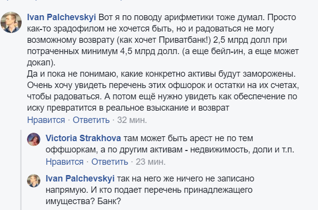 "Если стратегически - то пиз@ц котёнку. Сейчас активы арестованы как мера обеспечения иска. То есть распоряжаться ими Коломойский не сможет. Но управлять ими Приватбанк будет в состоянии только в случае удовлетворения иска судом. Но уже сейчас начнутся для Коломойского проблемы с личными счетами и кредитками. Что касается 1+1, то тут будет история как с НТВ. Когда после прихода к власти Путина к НТВ предъявил претензии по кредитам Газпромбанк. И вскоре телекомпания перешла под его контроль. А значит и под контроль государства".