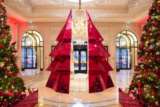 Арт-директор сети Four Seasons Джефф Литэм по совместительству еще и известный флорист. Однако, в этом году он отошел от привычных фактур и установил в лобби отеля Four Seasons Hotel George V в Париже стеклянную скульптуру рубинового оттенка. Пространство внутри этой «ели» напоминает арку, через которую можно свободно проходить.