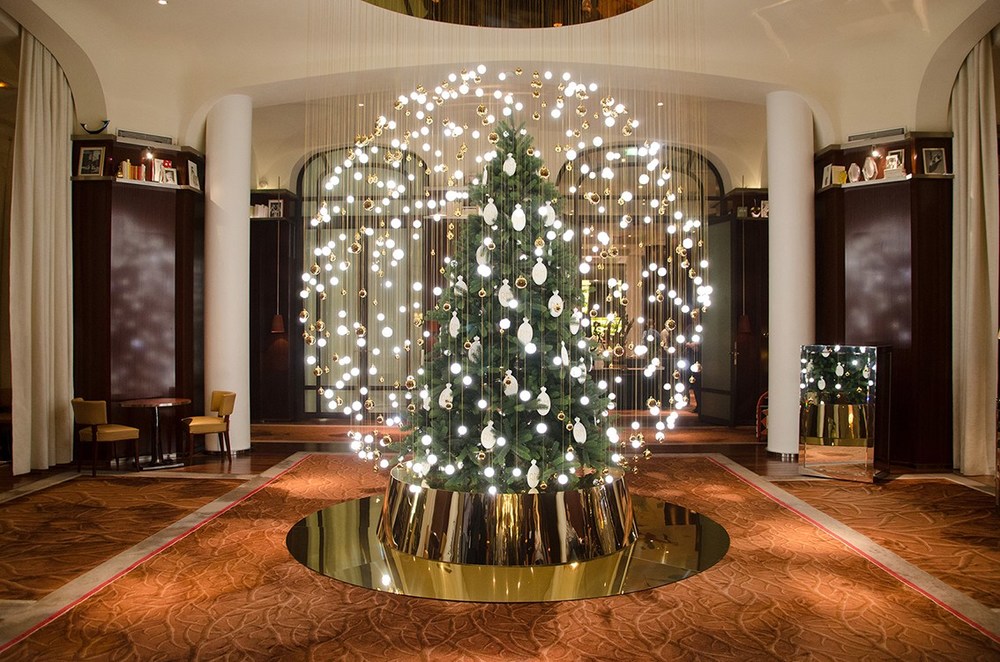 Рождественское дерево, встречающее постояльцев и гостей парижского отеля Le Royal Monceau Paris в холле, напоминает "снежный шар" – сувенир с моделью и водой внутри, который был изобретен во Франции. 3-метровая ель украшена игрушками из стекла ручной работы и бронзовыми медальонами с гербом Le Royal Monceau.