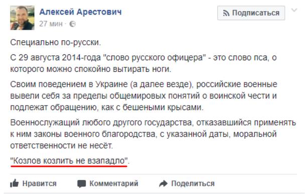 Другие сторонники "ДНР" припомнили Арестовичу посты с призывами обращаться с российскими военными, "как с бешеными крысами" (пост, написан после Иловайского котла). Вот он: