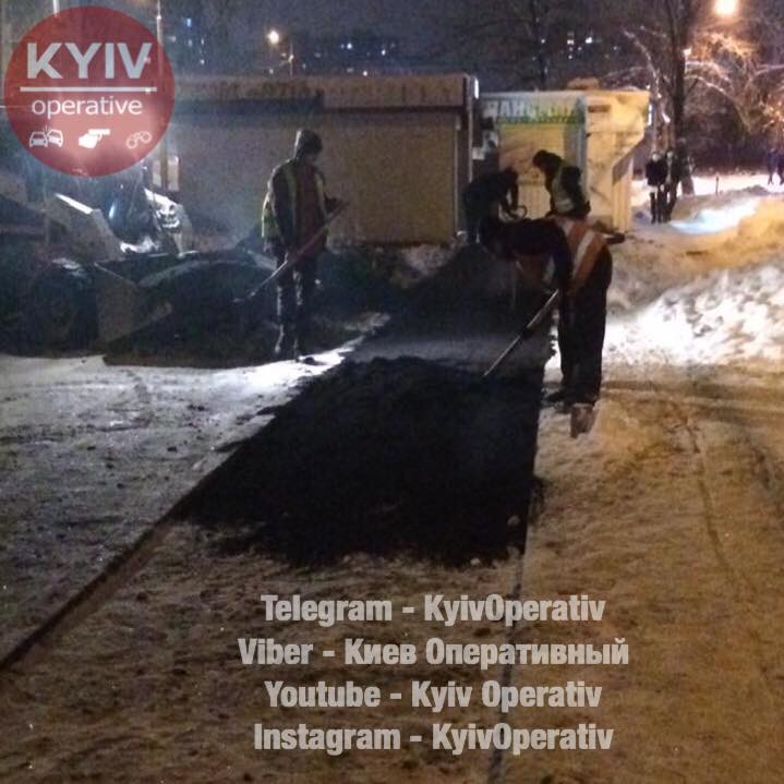 Возле станции метро "Героев Днепра" рабочих, которые укладывали асфальт в таких неподходящих погодных условиях, заметили прохожие и сфотографировали.
