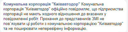 "Киевавтодор" официально сообщает, что предприятия корпорации не имеют никакого отношения к указанным в сообщении работам. Просьба к представителям СМИ не связывать эти работы с коммунальной корпорацией "Киевавтодор" и не распространять непроверенную информацию", - заявили в КП.