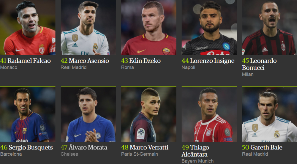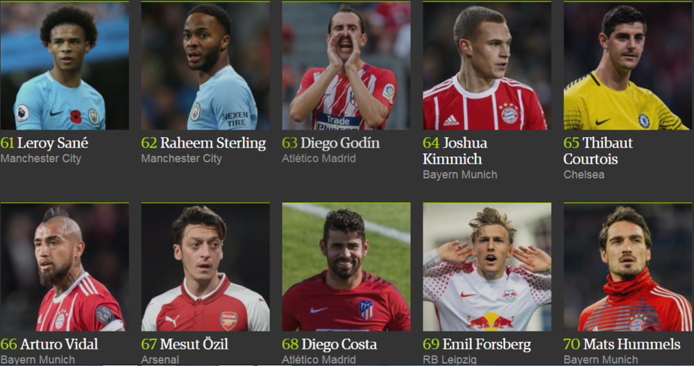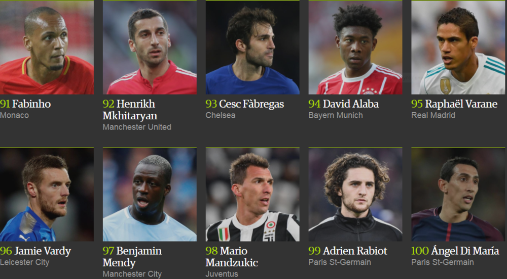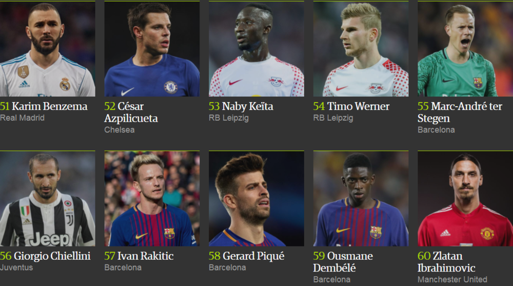Лионель Месси победил в рейтинге The Guardian в четвертый раз (2012, 2013, 2015, 2017), в то время как Криштиану Роналду признавался лучшим дважды (2014 и 2016 год).