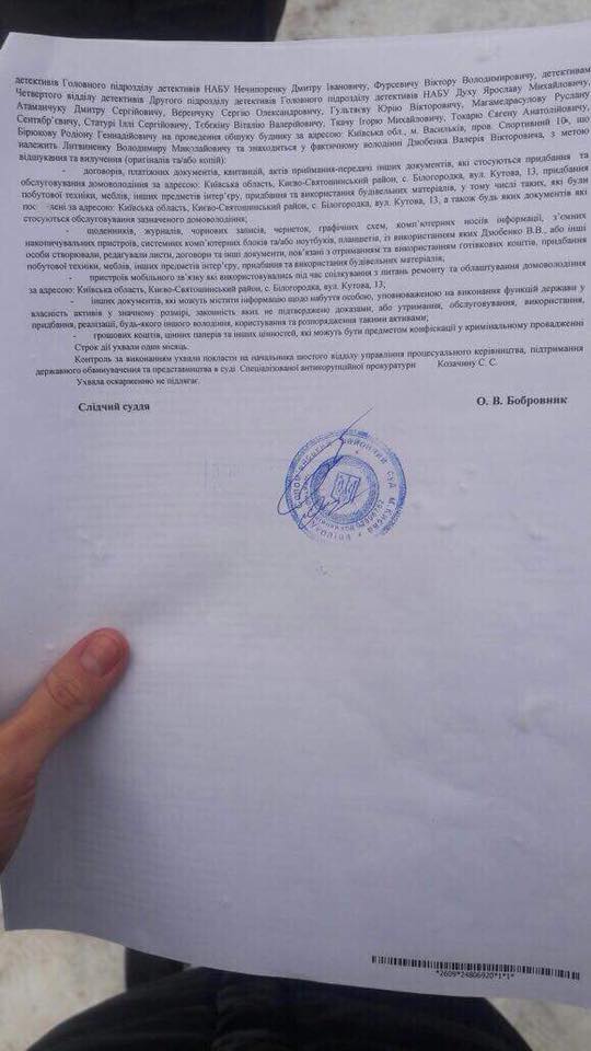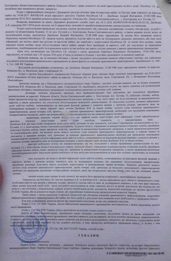 Поэтому обыск проводился у Дзюбенко, так как "по месту его жительства могут находиться принадлежащие Игорю Мосийчуку денежные средства, законность получения которых не подтверждена документами, или другие носители информации, которые содержат данные о движимом и недвтжимом имуществе И.Мосийчука, которое пребывает в его собственности и собственности его семьи, но передано другим лицам; по обслуживанию этого имущества, источников его приобретения и стоимости; лицах, которые прилекались к ремонтным работам и получали деньги за такие работы".