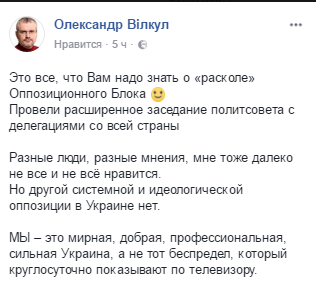 На этом, в частности, сделал акцент нардеп Александр Вилкул на своей странице в Facebook: "Это все, что Вам надо знать о "расколе" Оппозиционного Блока:) Провели расширенное заседание политсовета с делегациями со всей страны. Разные люди, разные мнения, мне тоже далеко не все и не всё нравится. Но другой системной и идеологической оппозиции в Украине нет. Мы – это мирная, добрая, профессиональная, сильная Украина, а не тот беспредел, который круглосуточно показывают по телевизору".