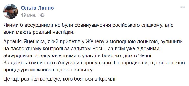 "Какими бы абсурдными ни были обвинения российского следом, но они имеют реальные последствия. Арсения Яценюка, который прилетел в Женеву с младшей дочерью, остановили на паспортном контроле по запросу России - по всем уже известными абсурдными обвинениями в участии в боевых действиях в Чечне. За десять минут все выяснили и пропустили. Предупредив, что аналогичная процедура возможна и при вылете", - написала Лаппо.