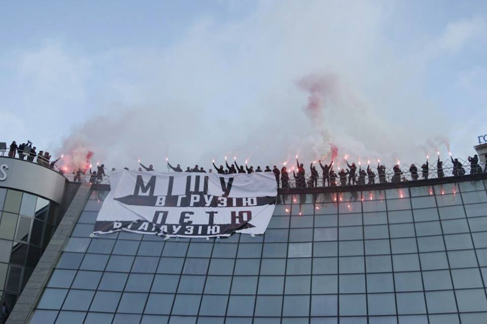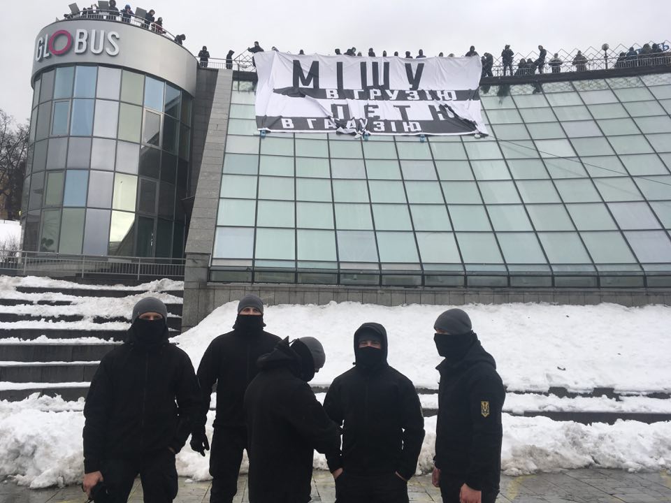 13:37 "Азовцы" пришли "испортить десерт" сторонникам Порошенко. Надпись на плакате: "Мишу - в Грузию, Петю - в Гагаузию".