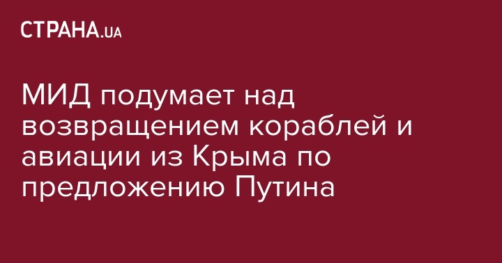 МИД Украины рассмотрит возможность вернуть украинскую авиацию и корабли из аннексированного Крыма, как предложил Владимир Путин. Несмотря на то, что ранее вице-спикер Ирина Геращенко категорично заявила, что Киев отказывается от таких предложений.