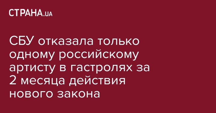 За два месяца действия нового закона о гастролях российских артистов, с 16 ноября 2017-го, СБУ получила 50 запросов на такие мероприятия и отказала только одному артисту. Об этом сообщили в спецслужбе на запрос "Украинских новостей".