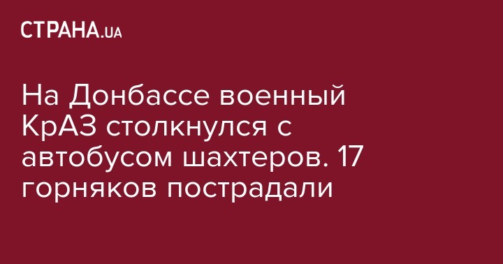 На Донбассе возле города Белицкое военный КрАЗ столкнулся с автобусом, который перевозил шахтеров, в результате чего пострадали 17 горняков. Об этом сообщил председатель Независимого профсоюза горняков Михаил Волынец в Facebook.