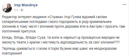Народный депутат от Радикальной партии Игорь Мосийчук заявил, что выезд главного редактора "Страны" Игоря Гужвы в Австрию "может привести к неоднократному повторению истории" зверски убитого Олеся Бузины.
