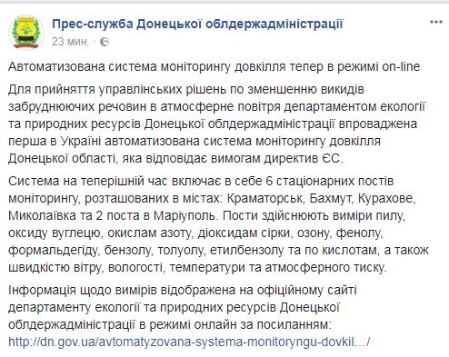 Ранее для принятия управленческих решений по уменьшению выбросов загрязняющих веществ в атмосферный воздух Департамент экологии и природных ресурсов Донецкой ОГА внедрил в регионе первую в Украине автоматизированную систему мониторинга окружающей среды.