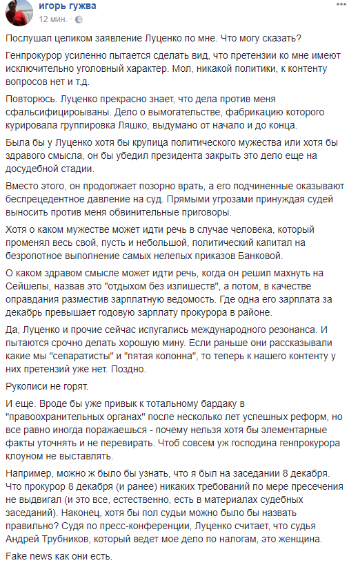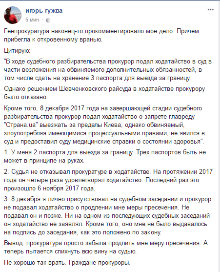 "Генпрокуратура прибегла к откровенному вранью", – написал Гужва на странице в Facebook.